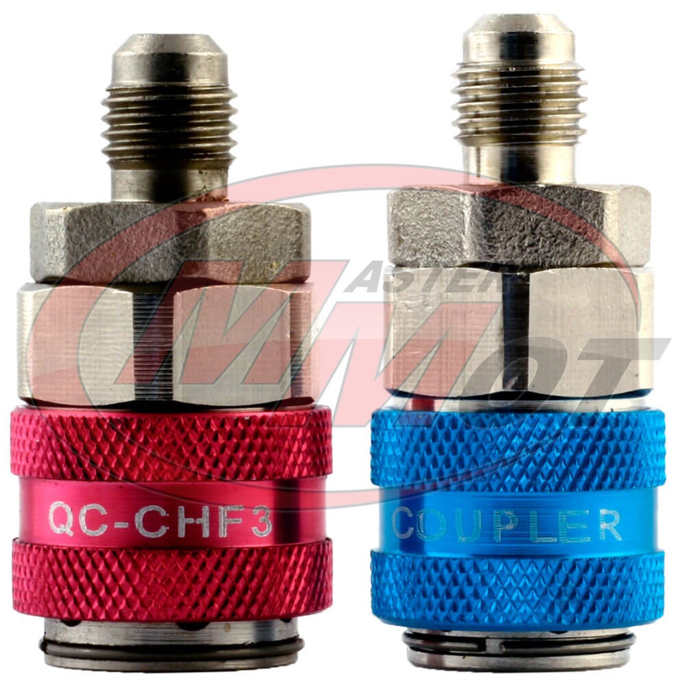 Zestaw adapterów do klimatyzacji, szybkozłączek prostych na wysokie i niskie ciśnienie z gwintem zewnętrznym 1/4" SAE. Komplet przyłączy serwisowych HP i LP na czynnik chłodniczy R134a przeznaczony do obsługi układów auto klimatyzacji.
