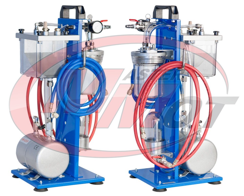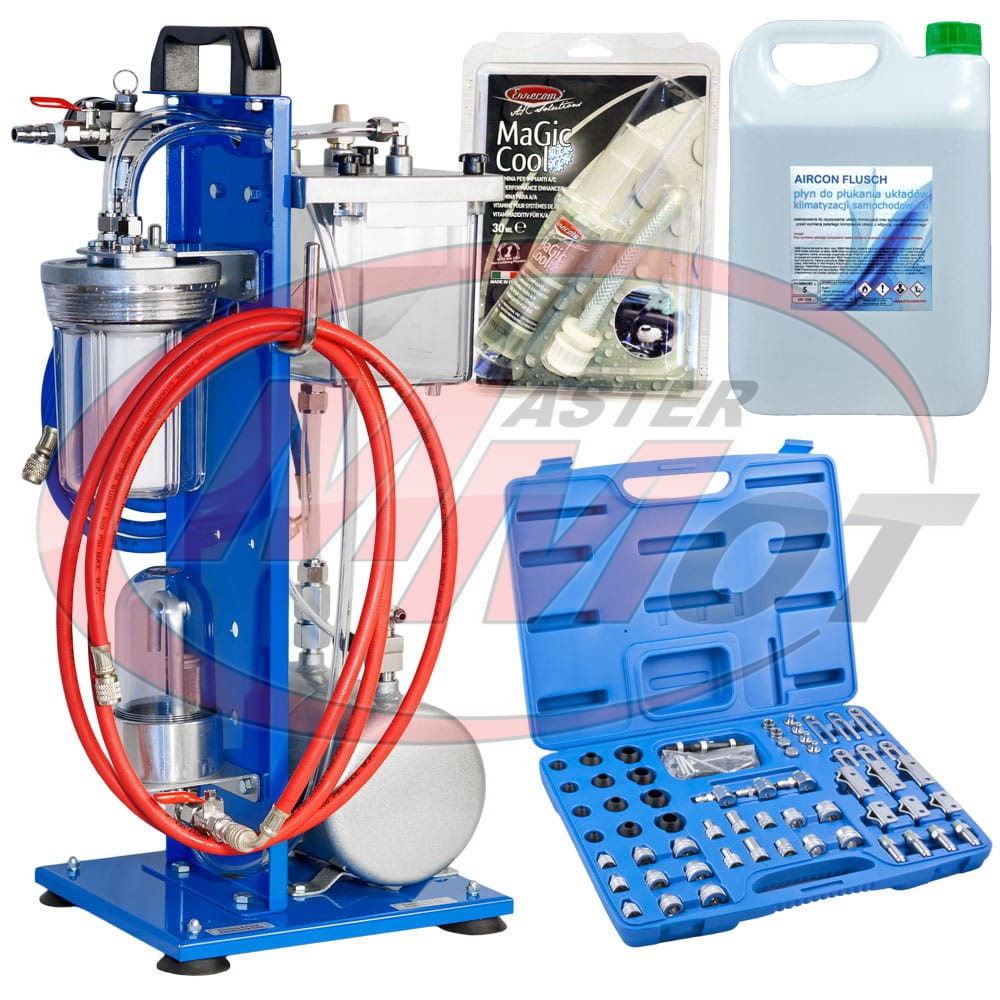 Specjalistyczny zestaw do płukania układów auto klimatyzacji 6 przeznaczony dla doświadczonych warsztatów klimatyzacji, jak i dla serwisów chcących poszerzyć swoje usługi o płukanie układów klimatyzacji. Kupując urządzenie do płukania należy również zaopatrzyć się w zestaw adapterów, aby móc połączyć stacje płuczącą z elementem, który ma być czyszczony oraz specjalistyczny środek płuczący przeznaczony do płukania układów klimatyzacji.