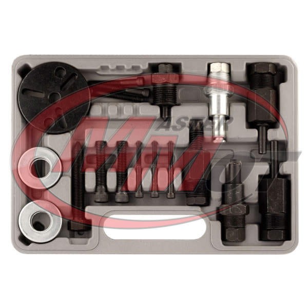 Uniwersalny komplet ściągaczy do sprzęgieł sprężarek klimatyzacji 18 elementów w walizce. Zestaw ściągaczy do sprzęgieł kompresorów klimatyzacji 18 elementów. Uniwersalny zestaw kluczy przeznaczony do naprawy sprężarek auto klimatyzacji, stanowi podstawowe wyposażenie każdego warsztatu naprawczego.