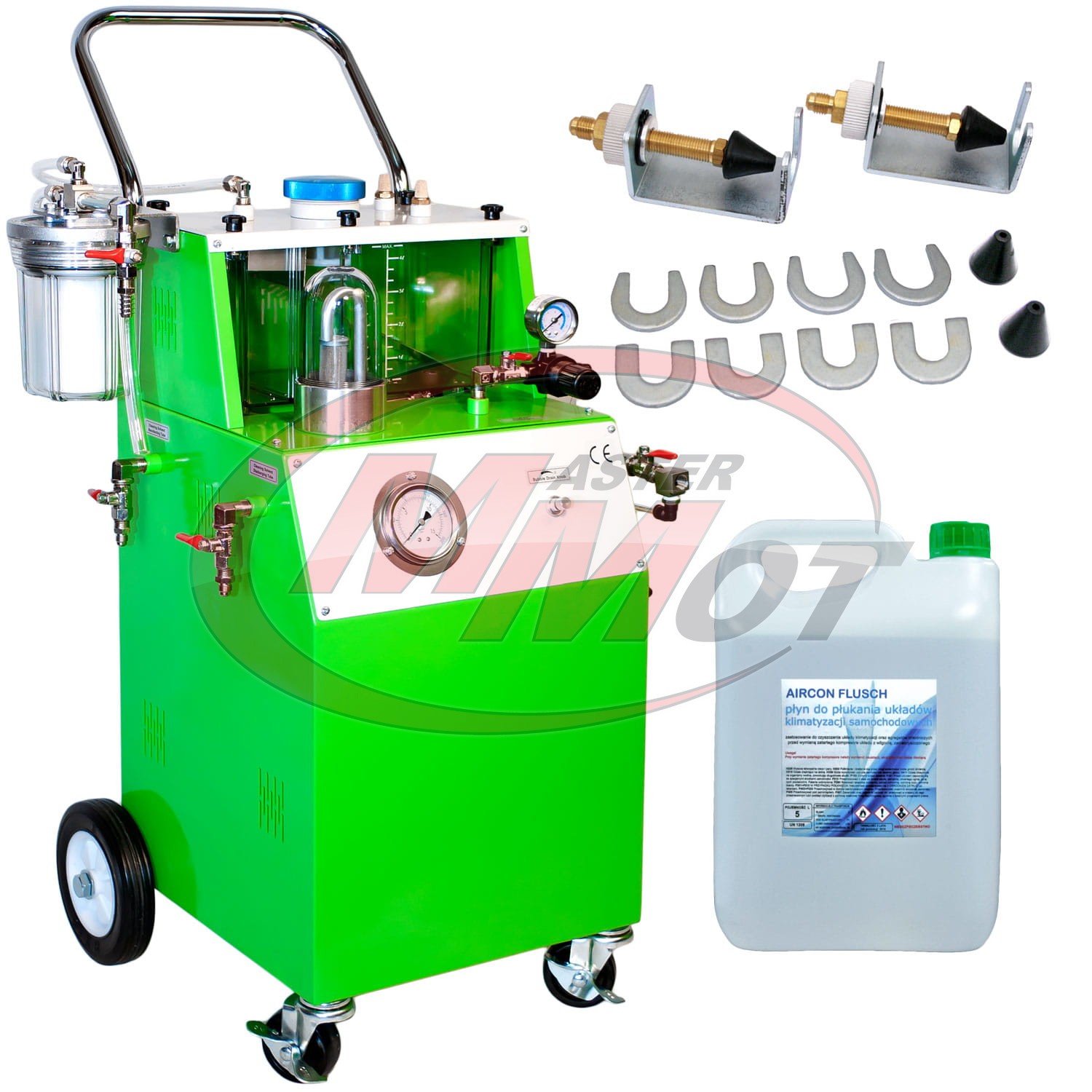 Specjalistyczny zestaw do płukania układów auto klimatyzacji 7 przeznaczony dla doświadczonych warsztatów klimatyzacji, jak i dla serwisów chcących poszerzyć swoje usługi o płukanie układów klimatyzacji. Kupując urządzenie do płukania należy również zaopatrzyć się w zestaw adapterów, aby móc połączyć stacje płuczącą z elementem, który ma być czyszczony oraz specjalistyczny środek płuczący przeznaczony do płukania układów klimatyzacji.