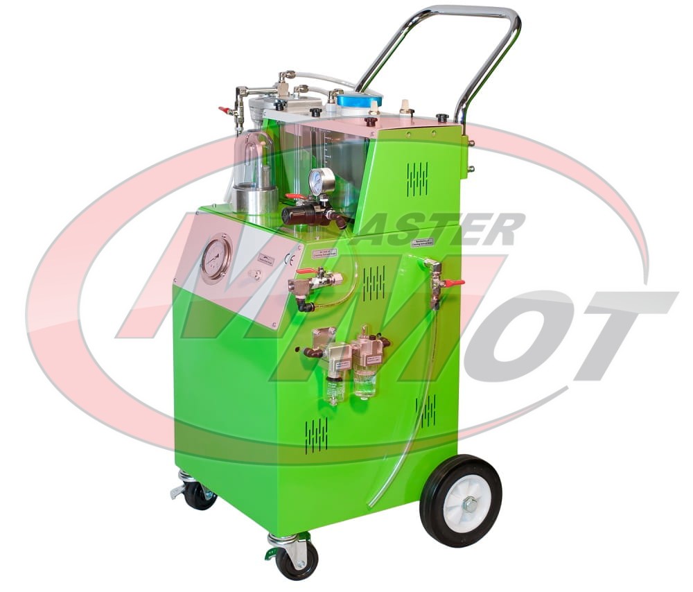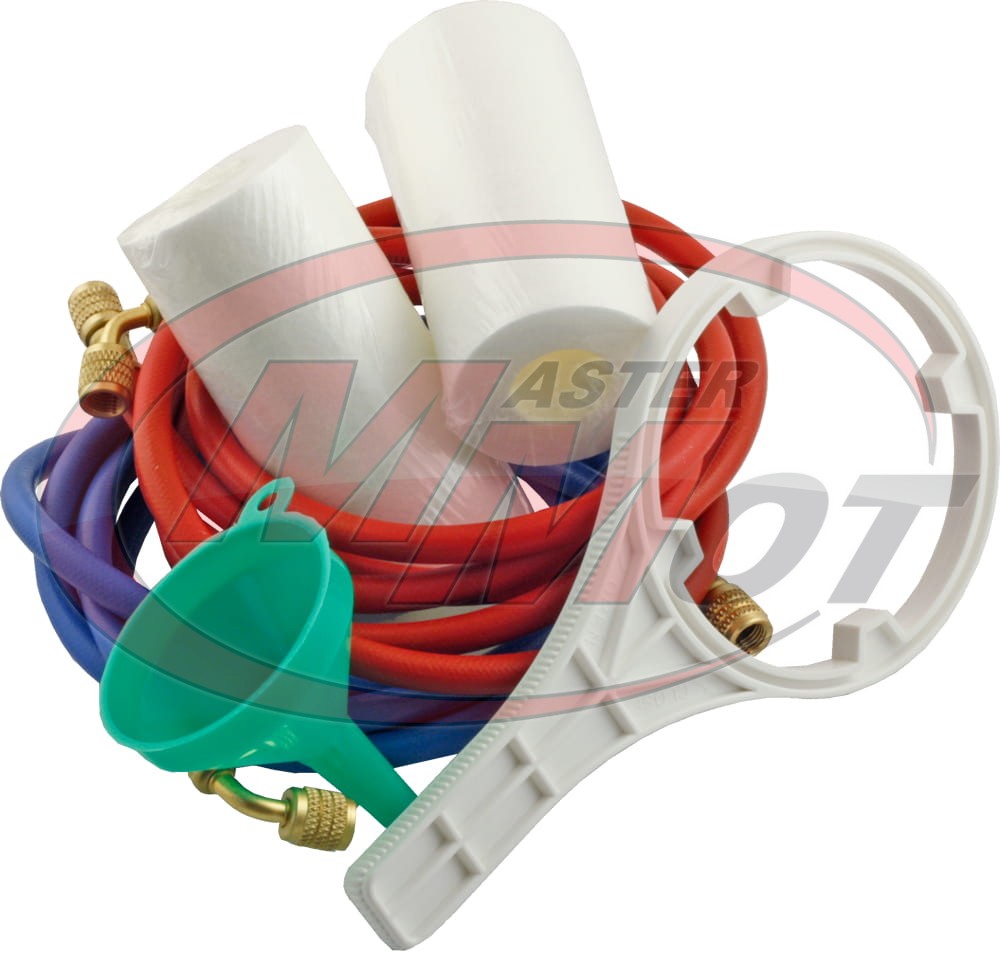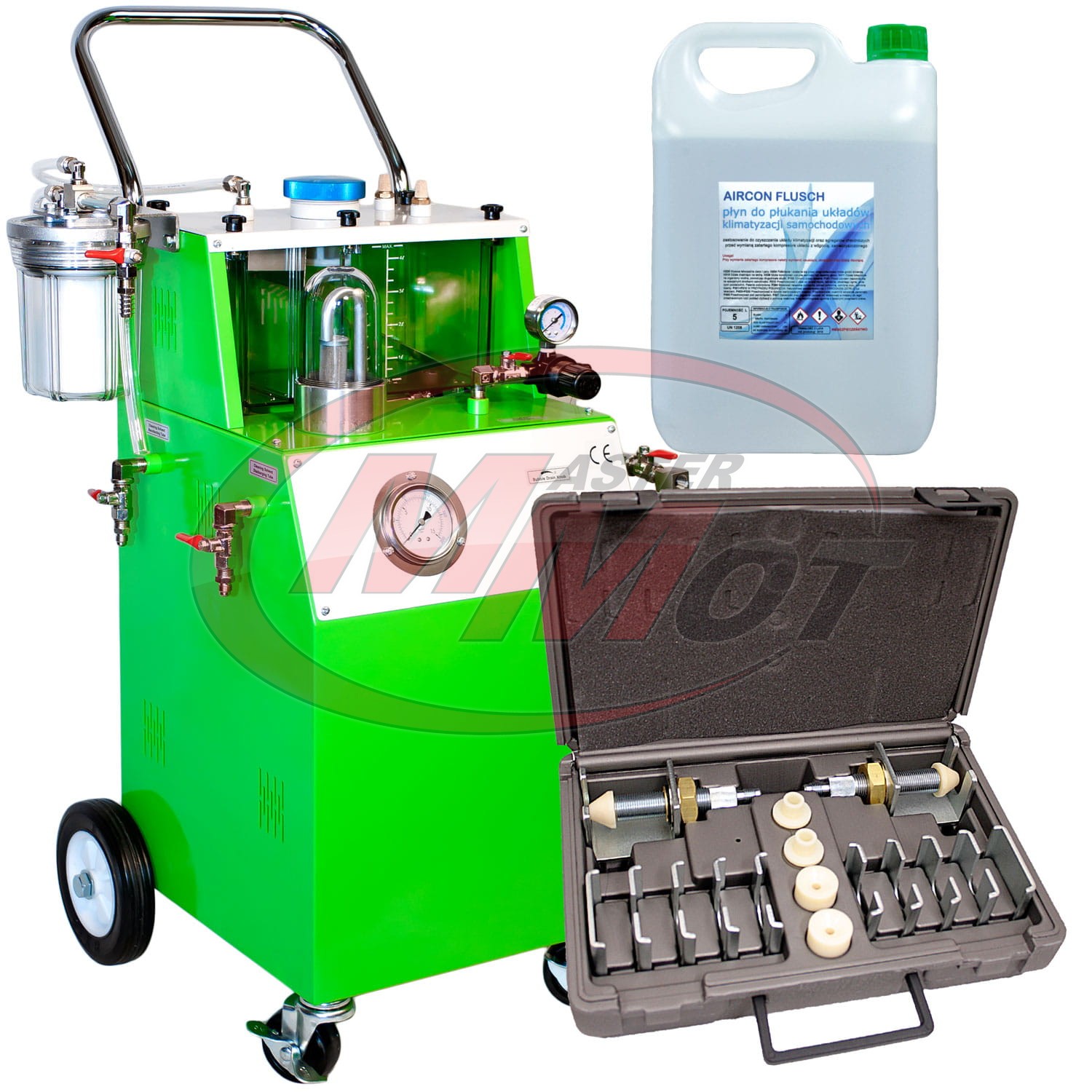 Specjalistyczny zestaw do płukania układów auto klimatyzacji 8 przeznaczony dla doświadczonych warsztatów klimatyzacji, jak i dla serwisów chcących poszerzyć swoje usługi o płukanie układów klimatyzacji. Kupując urządzenie do płukania należy również zaopatrzyć się w zestaw adapterów, aby móc połączyć stacje płuczącą z elementem, który ma być czyszczony oraz specjalistyczny środek płuczący przeznaczony do płukania układów klimatyzacji.