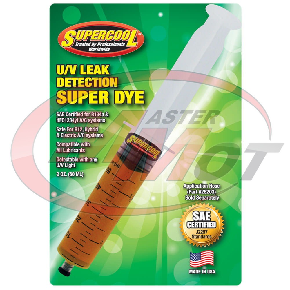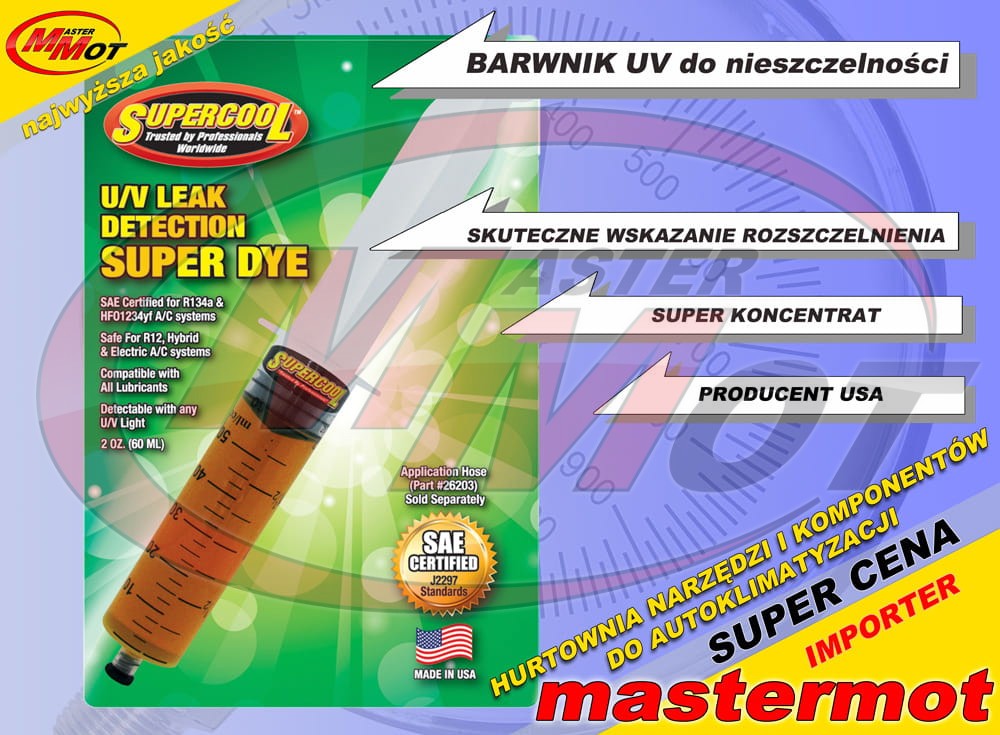- najwyższej jakości barwnik UV w strzykawce amerykańskiej firmy Supercool, specjalizującej się w produkcji chemii do auto klimatyzacji oraz chłodnictwa