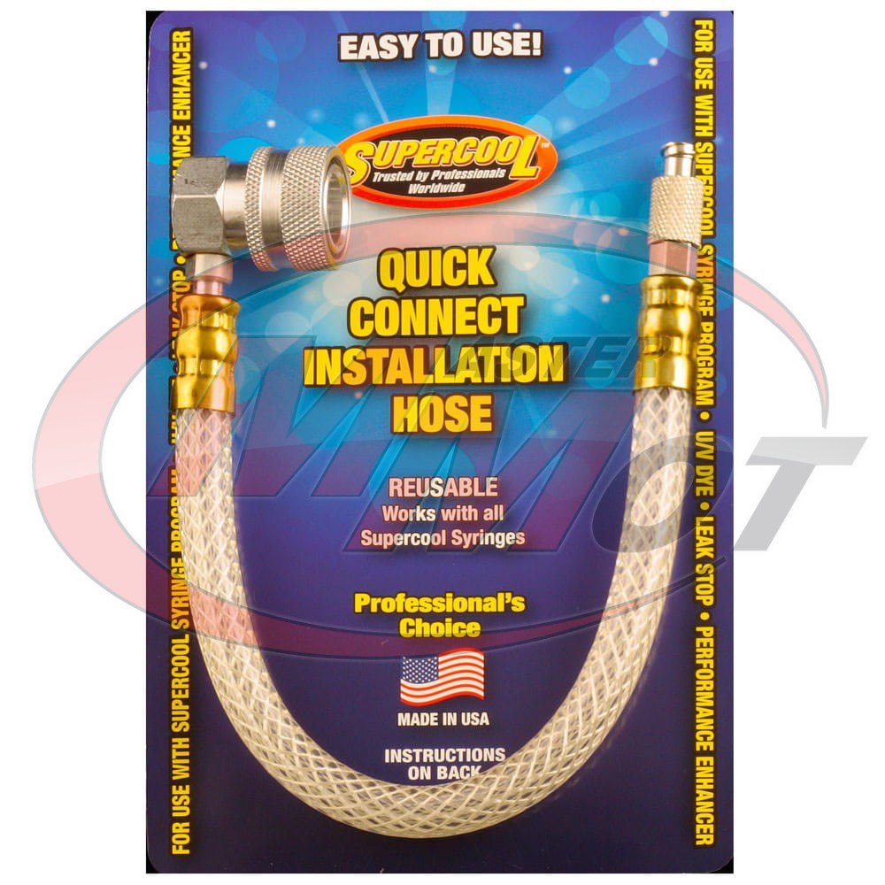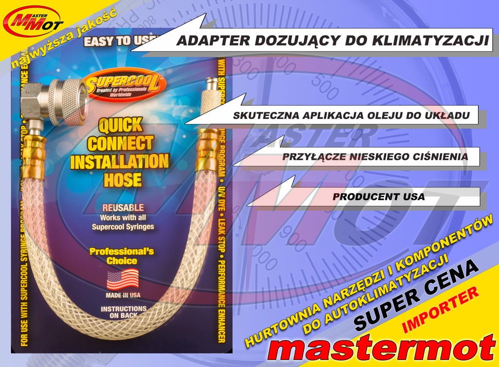 Adapter z wężem używany przy aplikacji do układu klimatyzacji oleju, barwnika, uszczelniacza lub odżywek. Adapter niskiego ciśnienia z wężem kompatybilny ze strzykawkami z preparatami firmy SUPERCOOL.